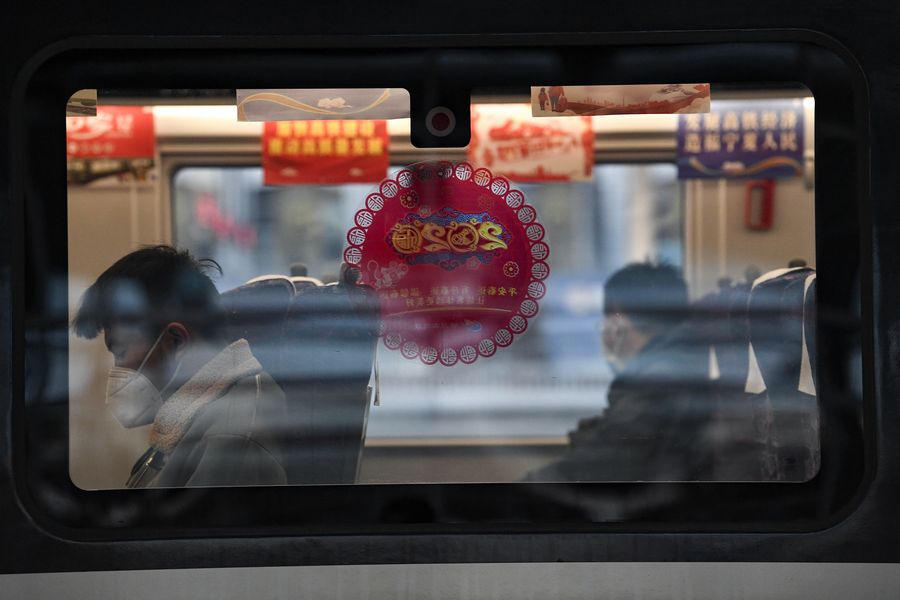 Passengers keep a distance from each other on the train C8201 from Yinchuan to Zhongwei, in northwest China's Ningxia Hui Autonomous Region, Feb. 18, 2020.(Xinhua/Feng Kaihua)