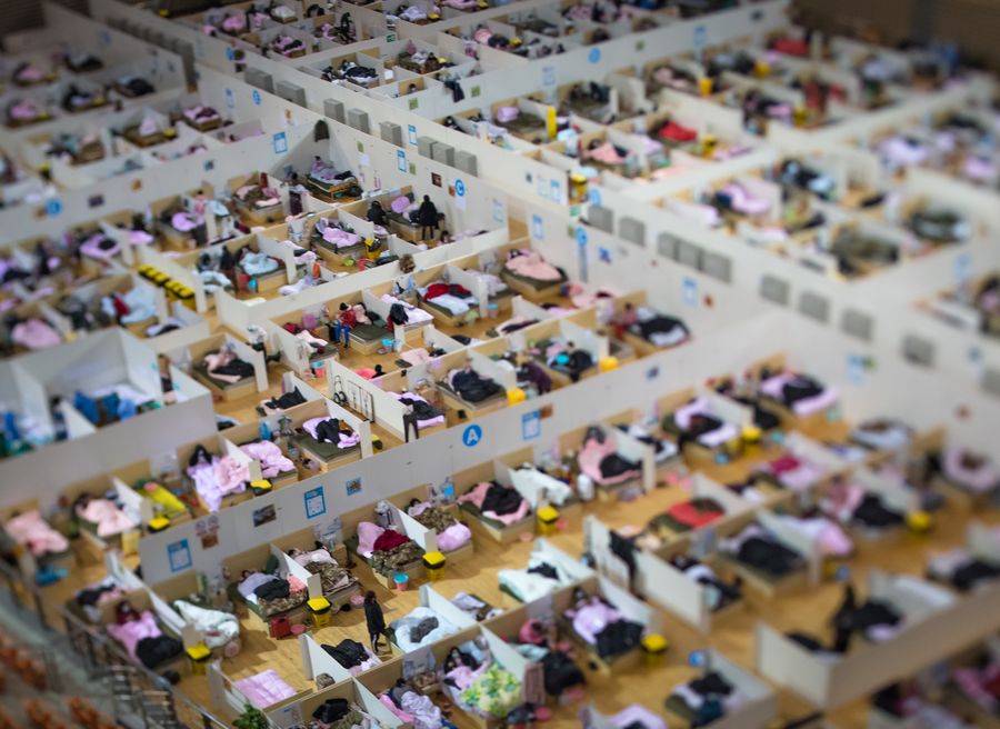 Photo taken on Feb. 17, 2020 with a tilt-shift lens shows a temporary hospital converted from Wuhan Sports Center in Wuhan, central China's Hubei Province. (Xinhua/Xiao Yijiu)