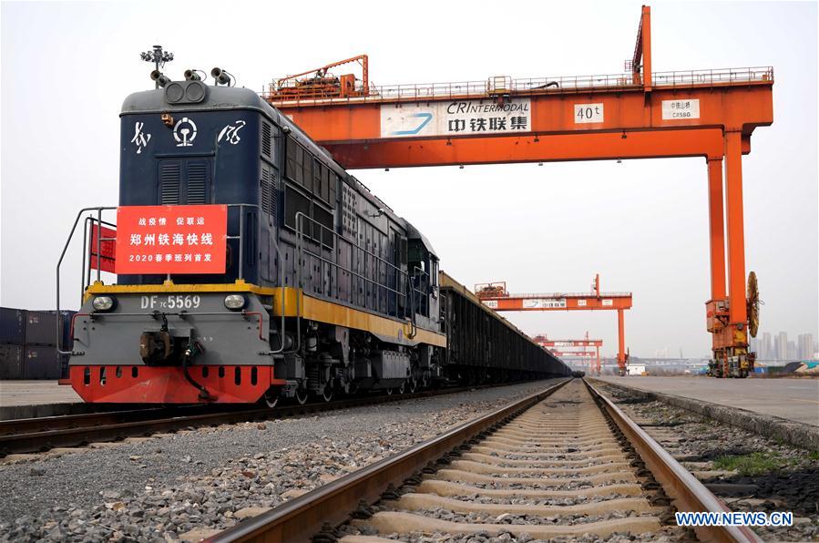 A sea-rail intermodal freight train waits for departure at the Zhengzhou terminal of China Railway Intermodal in Zhengzhou, central China's Henan Province, Feb. 19, 2020. The sea-rail intermodal freight train, loaded with 35 sets of containers, left from Zhengzhou terminal of China Railway Intermodal in Henan to Qingdao port of Shandong on Wednesday, making the restoration of its regular operation after the Chinese Spring Festival of 2020. (Xinhua/Li An)