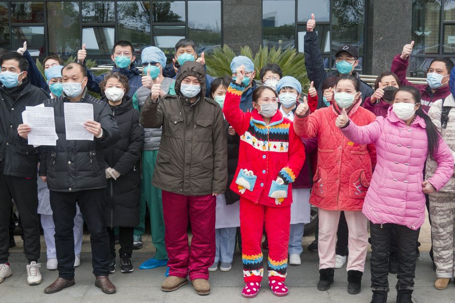 The recovered patients with severe novel coronavirus pneumonia (NCP) pose for photos with medical staff at the west campus of Wuhan Union Hospital in Wuhan, central China's Hubei Province, Feb. 19, 2020. A total of 31 patients infected with severe NCP recovered and were discharged on Wednesday from the hospital, after receiving medical treatment of nearly two weeks. (Xinhua/Cai Yang)