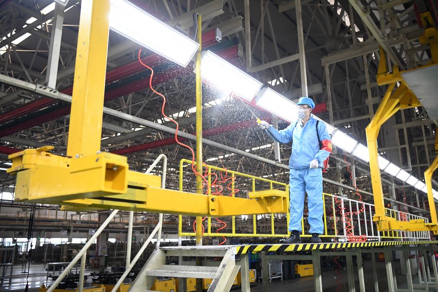 A worker disinfects a workshop of Lifan Group as preparation for the resumption of work on the next day, in Beibei District of Chongqing Municipality in southwest China, Feb. 19, 2020. (Xinhua/Tang Yi)