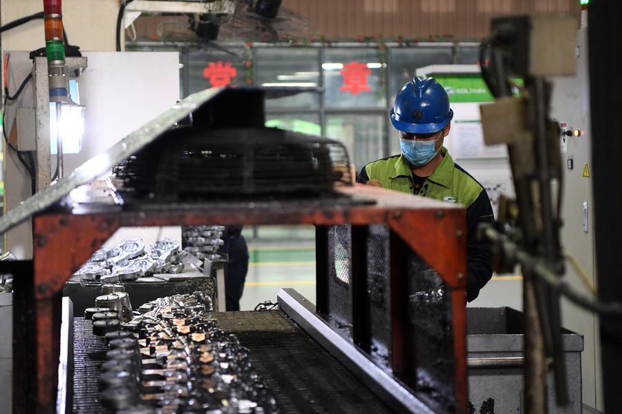 A staff member works on a production line of Chongqing Shunduoli Motor-vehicle Co., Ltd. in Beibei District of Chongqing Municipality in southwest China, Feb. 19, 2020. (Xinhua/Tang Yi)