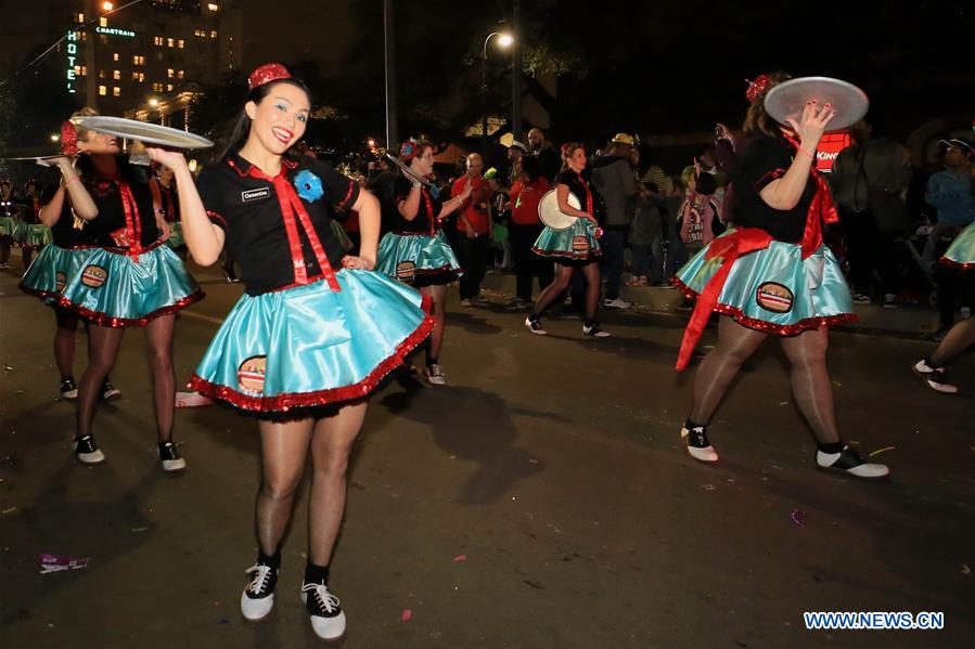 Dancers perform during the Krewe of Nyx parade in New Orleans of Louisiana, the United States, on Feb. 19, 2020. The Krewe of Nyx parade features beautiful hand-made purses and is a female-dominated parade of the Mardi Gras Carnival. (Photo by Lan Wei/Xinhua)
