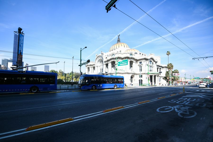 Trolley buses manufactured by Chinese company Yutong run near the Palacio de Bellas Artes in Mexico City, Mexico, on Jan. 17, 2020. (Xinhua/Xin Yuewei)