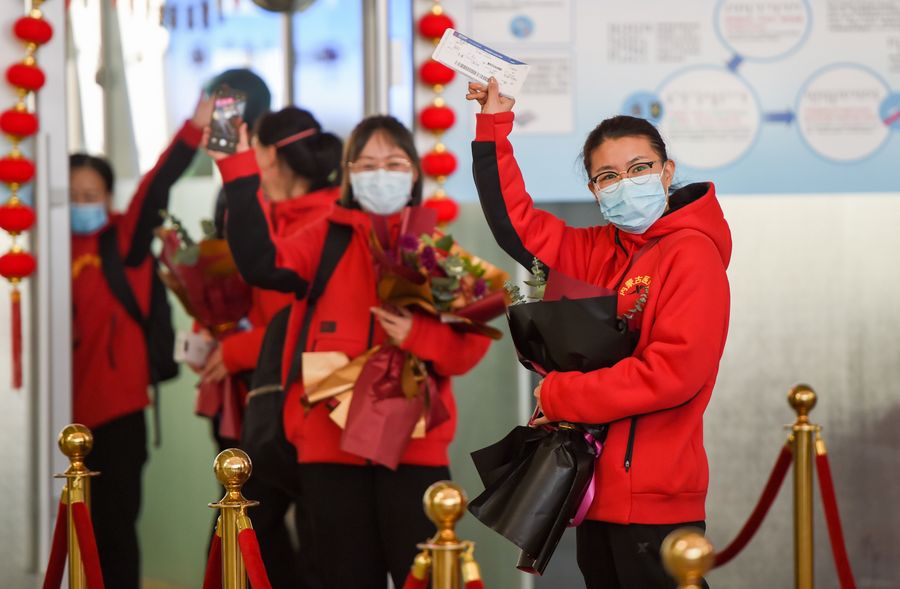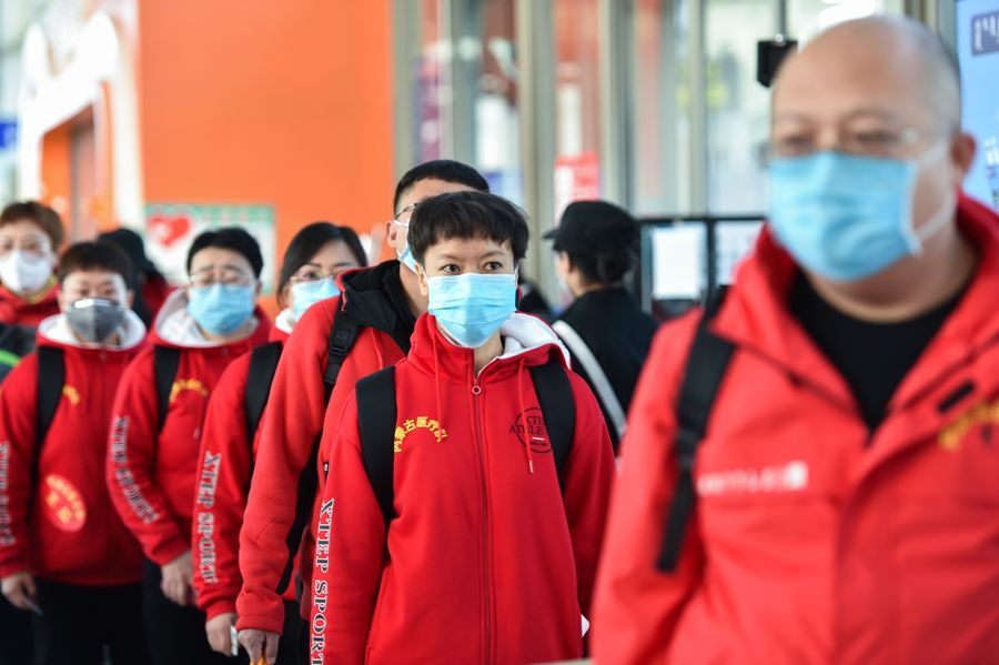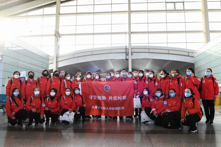 Medical team members are seen before leaving for Hubei Province at Hohhot Baita International Airport in Hohhot, capital of north China's Inner Mongolia Autonomous Region, Feb. 21, 2020. (Xinhua/Liu Lei)