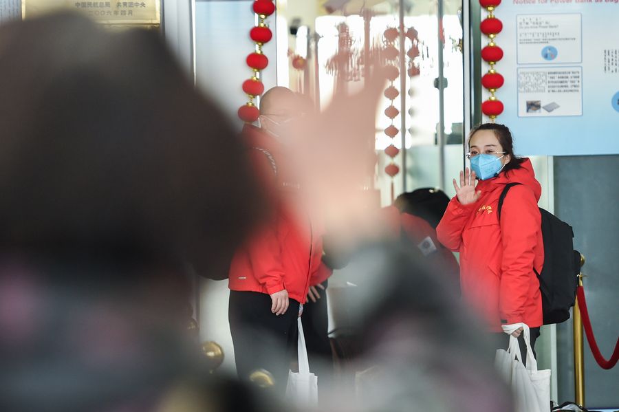Medical team members wave goodbye to their families before leaving for Hubei Province at Hohhot Baita International Airport in Hohhot, capital of north China's Inner Mongolia Autonomous Region, Feb. 21, 2020. (Xinhua/Lian Zhen)