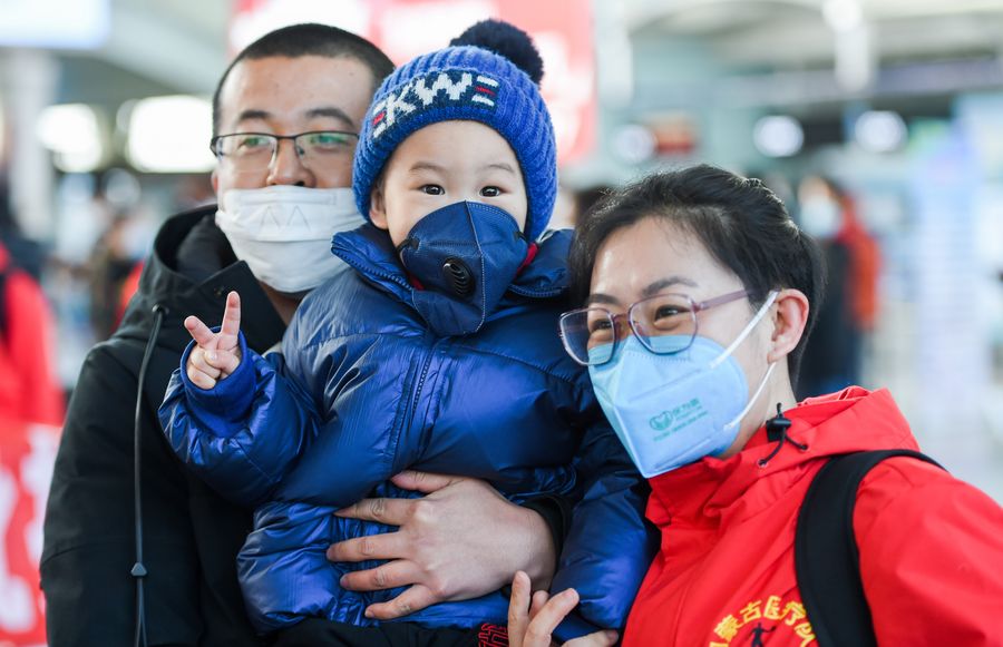 A medical worker (R) waves goodbye to her family before leaving for Hubei Province at Hohhot Baita International Airport in Hohhot, capital of north China's Inner Mongolia Autonomous Region, Feb. 21, 2020. (Xinhua/Liu Lei)