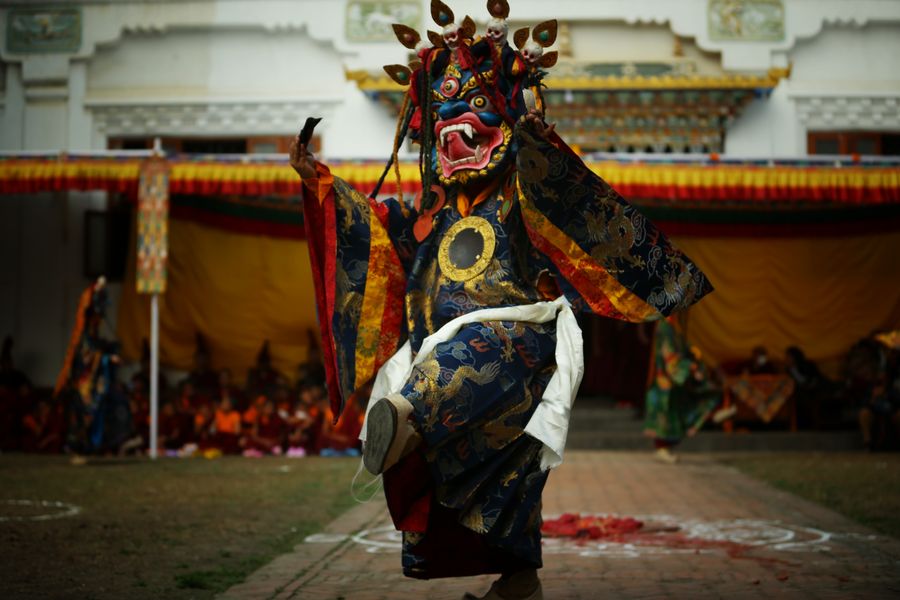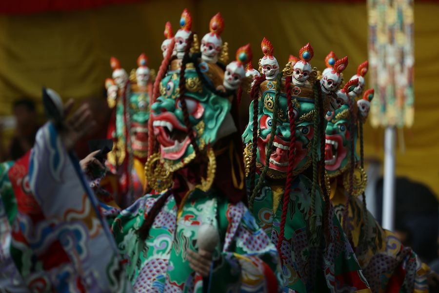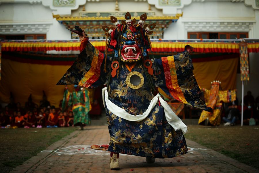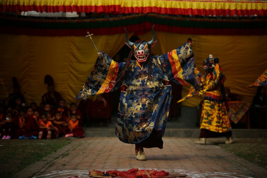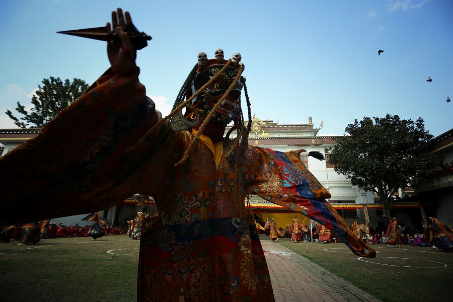 A Buddhist Lama in Traditional attire performs during Cham dance at a monastery in Kathmandu, Nepal, Feb. 22, 2020. The tradition is deeply rooted and practiced in China's Tibet, Bhutan, India and Nepal. (Xinhua/Sulav Shrestha)