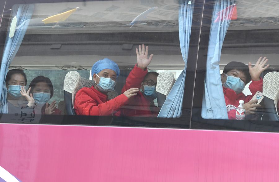Medical team members wave goodbye before leaving for Wuhan in Nanning, south China's Guangxi Zhuang Autonomous Region, Feb. 21, 2020. (Xinhua/Zhou Hua)