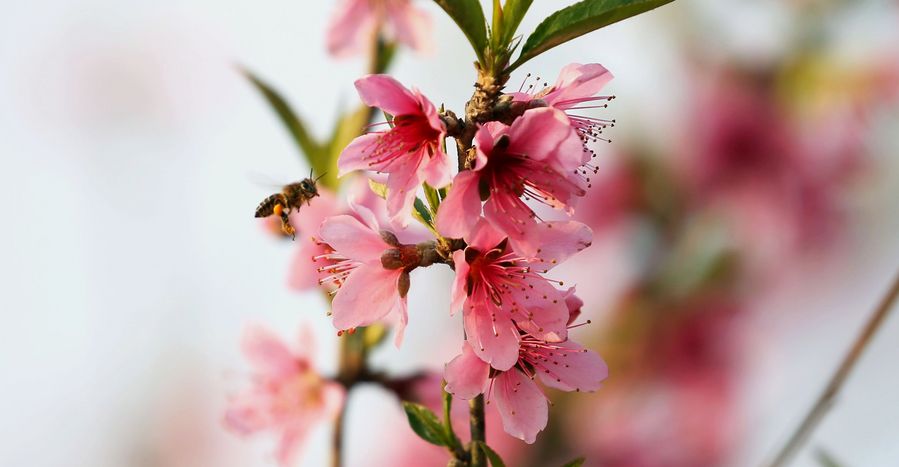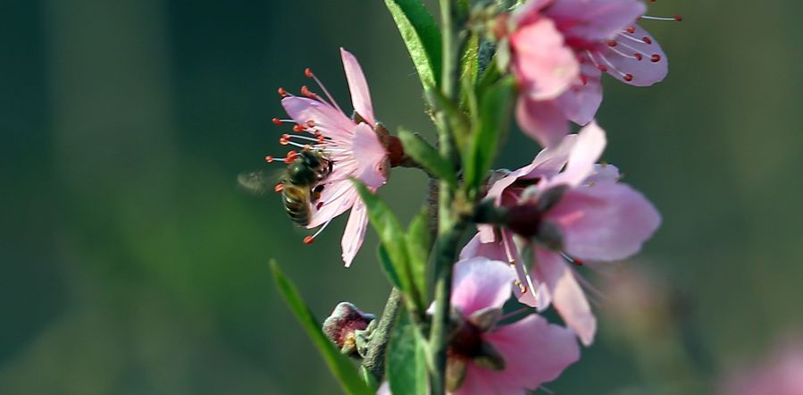 A bee sucks nectar from flowering cherry blossoms in a garden in Kathmandu, Nepal, Feb. 23, 2020. (Photo by Sunil Sharma/Xinhua)