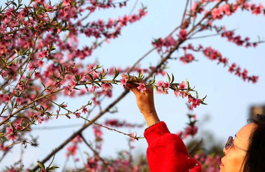 A woman looks at flowering cherry blossoms in a garden in Kathmandu, Nepal, Feb. 23, 2020. (Photo by Sunil Sharma/Xinhua)