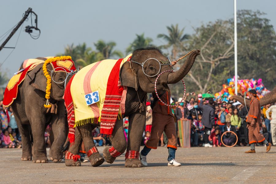 Elephants perform dance at the Elephant Festival 2020 held in northern Lao province of Xayaboury on Feb. 22, 2020. (Photo by Kaikeo Saiyasane/Xinhua)