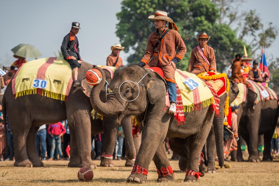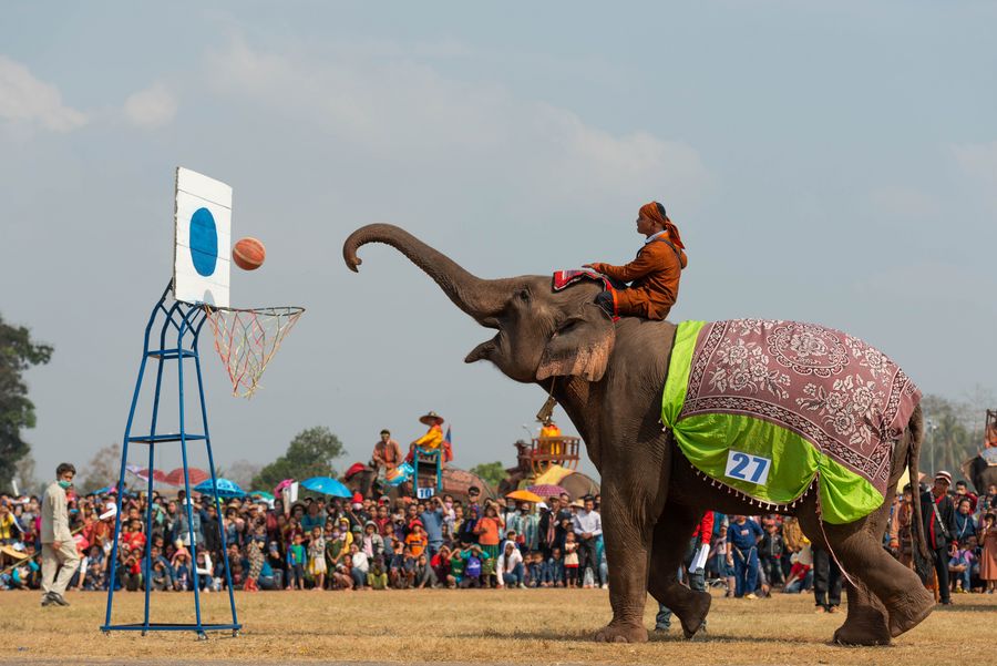 An elephant plays basketball at the Elephant Festival 2020 held in northern Lao province of Xayaboury on Feb. 22, 2020. (Photo by Kaikeo Saiyasane/Xinhua)