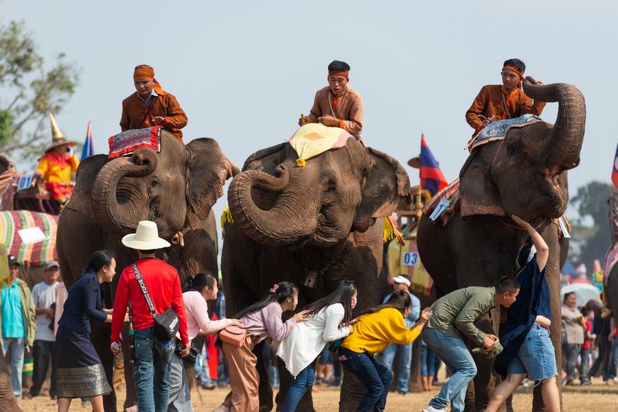 Elephants interact with tourists at the Elephant Festival 2020 held in northern Lao province of Xayaboury on Feb. 22, 2020. (Photo by Kaikeo Saiyasane/Xinhua)