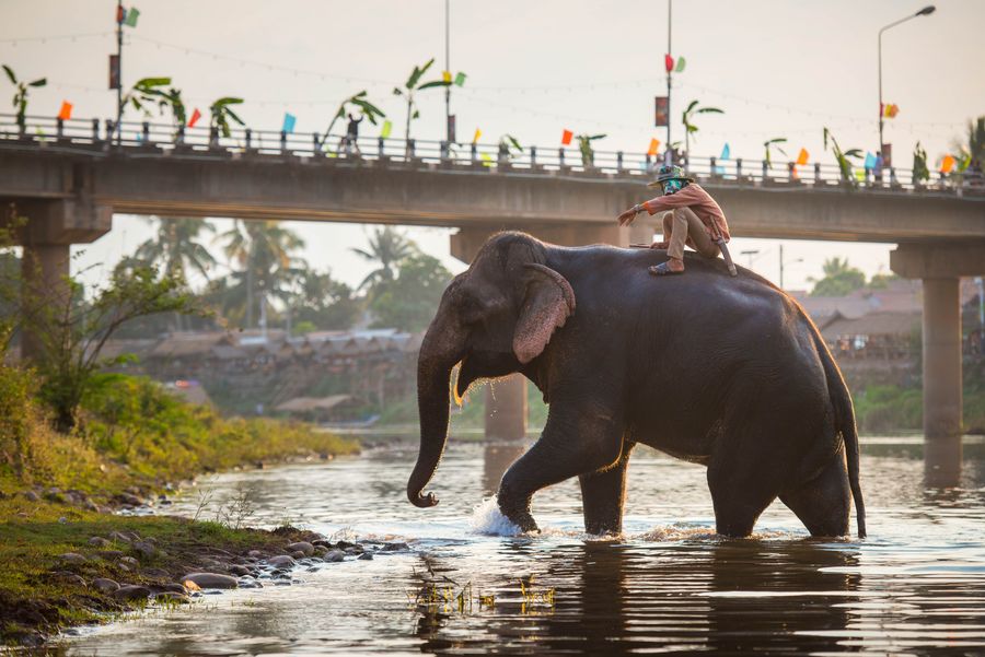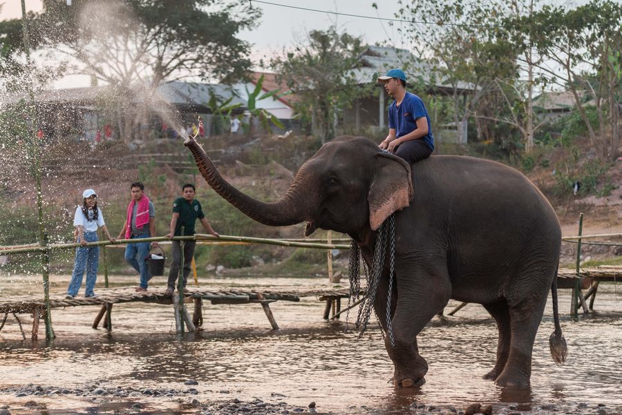 A man rides on an elephant during the Elephant Festival in a tributary of Mekong River in northern Lao province of Xayaboury, on Feb. 22, 2020. (Photo by Kaikeo Saiyasane/Xinhua) ■