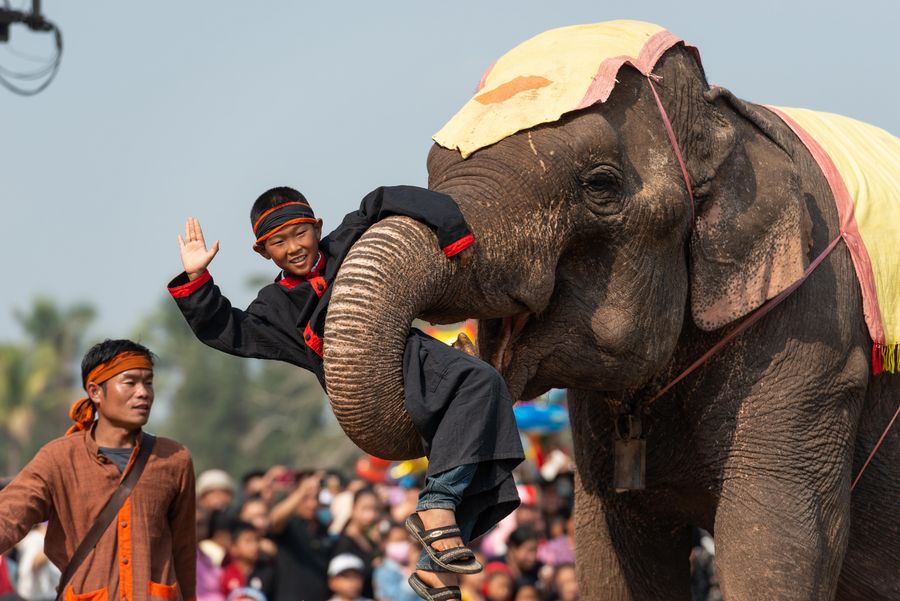 An elephant carries a kid at the Elephant Festival 2020 held in northern Lao province of Xayaboury on Feb. 22, 2020. (Photo by Kaikeo Saiyasane/Xinhua)