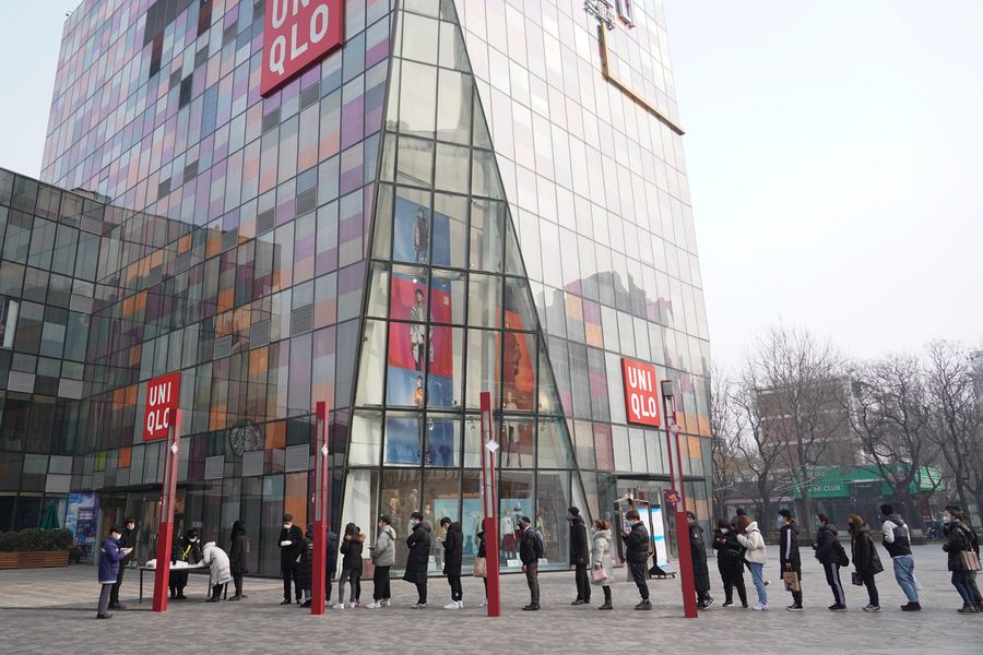 People line up to take body temperature checks at Sanlitun business area in Beijing, capital of China, on Feb. 12, 2020. Work and production has resumed gradually in enterprises, communities and malls, etc. in Beijing since Feb. 10 with comprehensive measures taken to prevent and control the epidemic caused by the novel coronavirus. (Xinhua/Ju Huanzong)