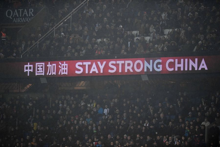 Message "stay strong China" both in English and Chinese is seen on the screen during the Ligue 1 football match between Paris Saint-Germain (PSG) and Bordeaux in Paris, France, Feb. 23, 2020. (Photo by Jack Chan/Xinhua)