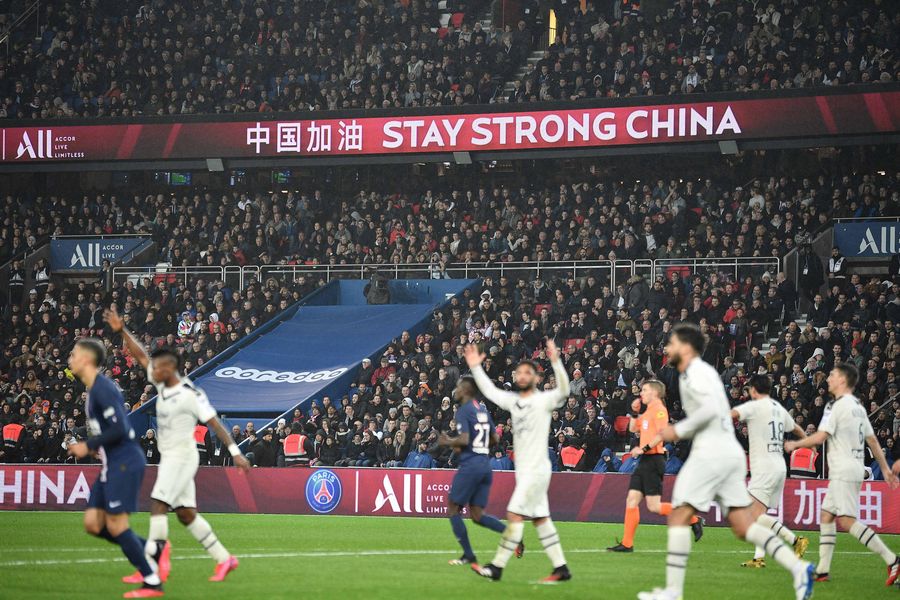 A banner "Stay Strong China" is seen during the Ligue 1 football match between Paris Saint-Germain (PSG) and Bordeaux in Paris, France, Feb. 23, 2020. (Photo by Jack Chan/Xinhua)