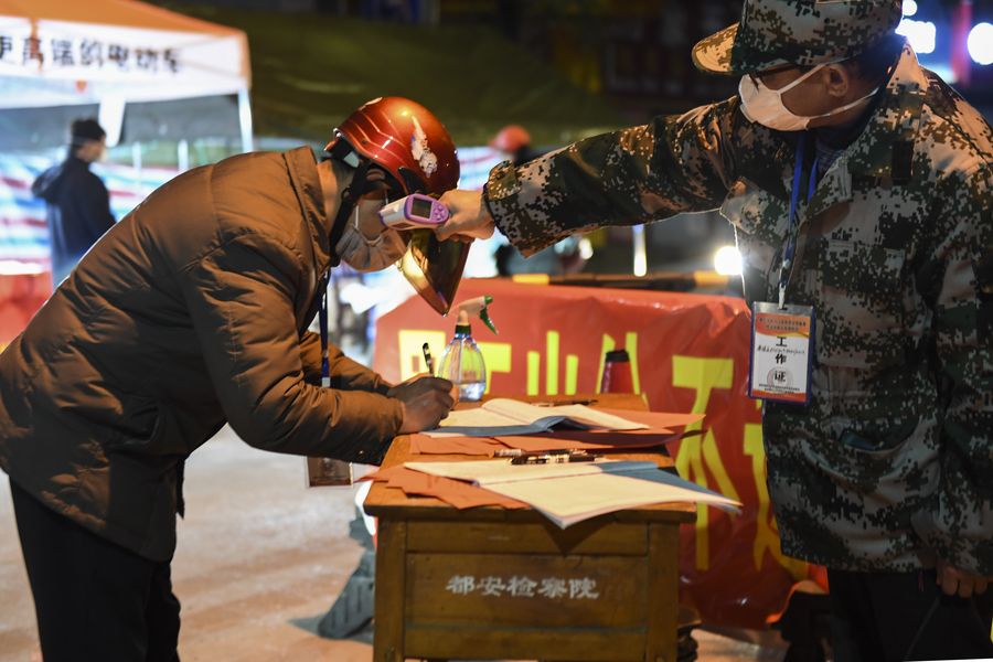 A staff member takes a pedestrian's body temperature on a main street of Du'an Yao Autonomous County, south China's Guangxi Zhuang Autonomous Region Feb. 18, 2020. (Xinhua/Cao Yiming)