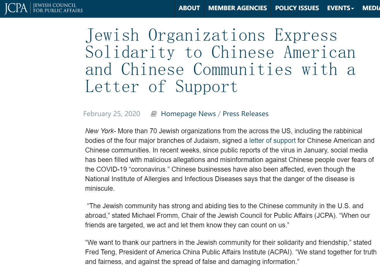Concerned about rising xenophobia in the United States and abroad over the spread of COVID-19, the JCPA has issued an open letter to voice support for the Chinese American and Chinese communities.