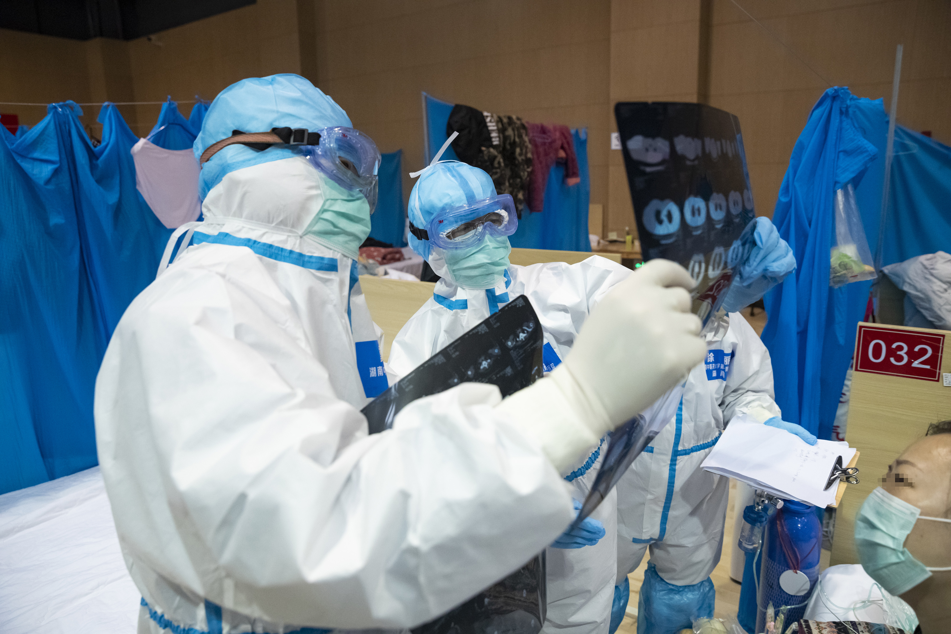 Doctors check a patient's CT image at a temporary hospital in Jiangxia District in Wuhan, central China's Hubei Province, Feb. 25, 2020. (Xinhua/Shen Bohan)