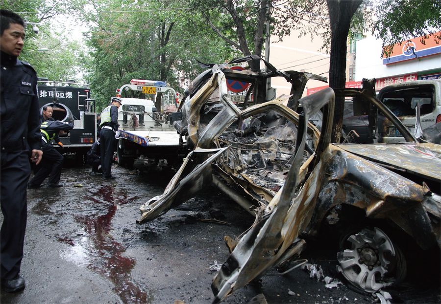 On May 22, 2014, five terrorists in two vehicles broke through roadside fences, plowed into the crowd, and set off explosive devices at a market in Gongyuanbei Street of Urumqi, northwest China's Xinjiang Uygur Autonomous Region, claiming 39 lives and injuring 94 people. (Xinhua)