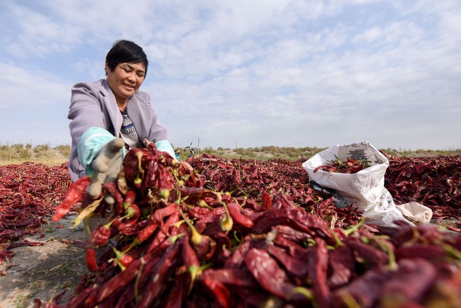 A farmer sorts chili peppers in Bohu County, northwest China's Xinjiang Uygur Autonomous Region, Oct. 13, 2019. (Xinhua/Ding Lei)