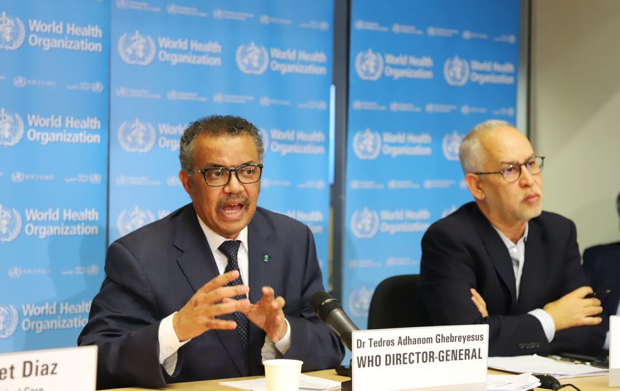 The World Health Organization (WHO) Director-General Tedros Adhanom Ghebreyesus (L) attends a daily briefing in Geneva, Switzerland, Feb. 20, 2020.(Xinhua/Chen Junxia)