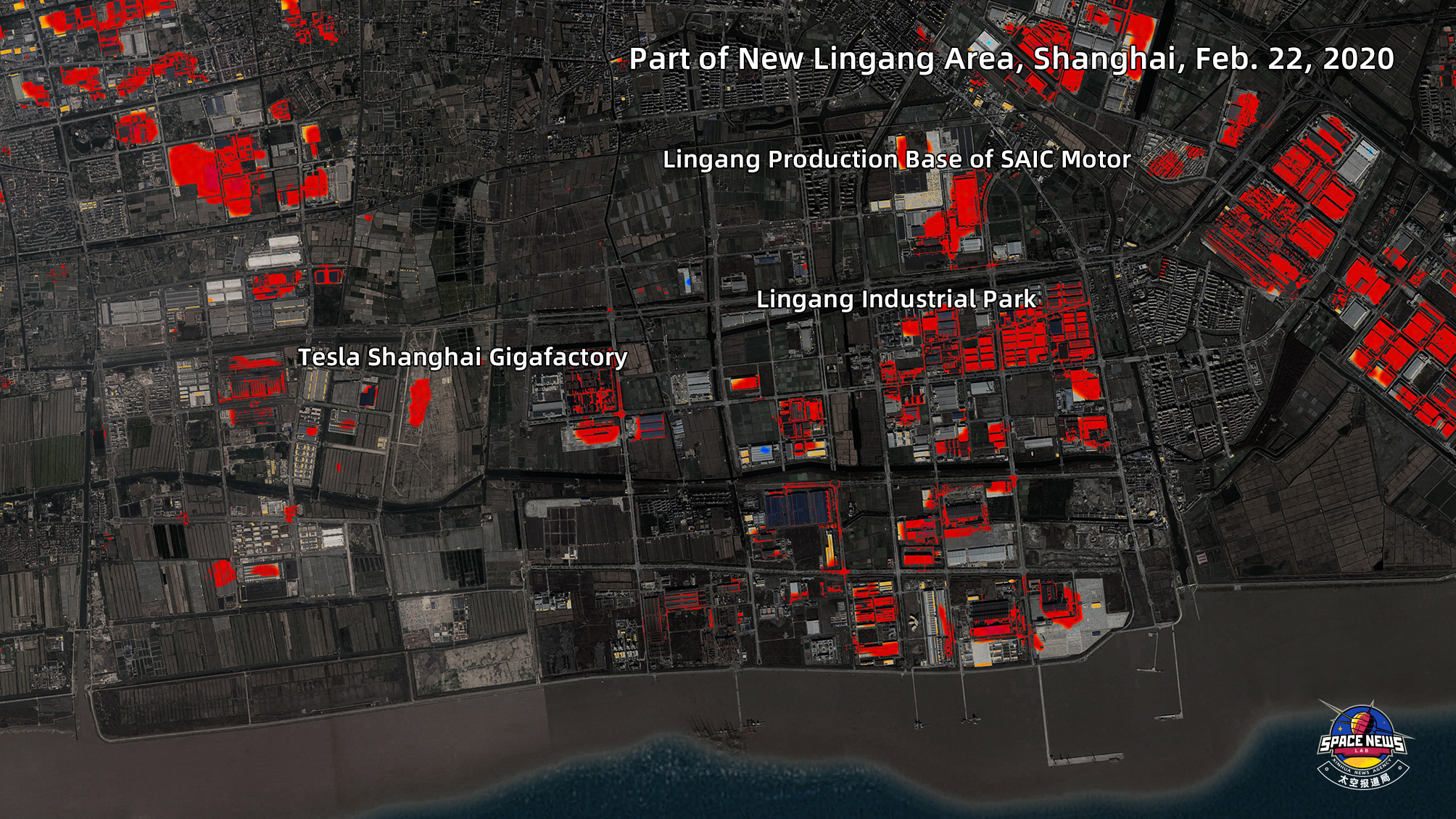 Satellite image of the Tesla Shanghai Gigafactory, Lingang Industrial Park and the Lingang Production Base of SAIC Motor in Shanghai,on Feb. 22, 2020.