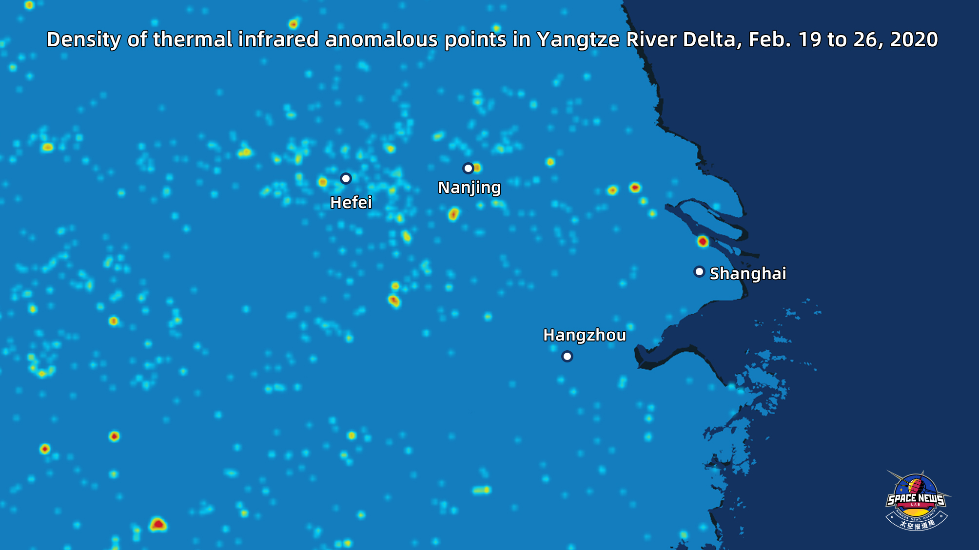 Satellite image shows the density of thermal infrared anomalous points in Yangtze River Delta during the period from Feb. 19 to 26, 2020.