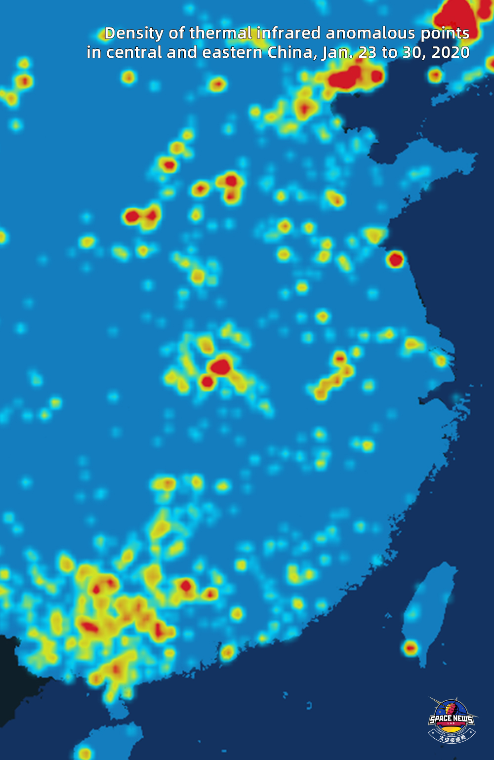 Satellite image shows the density of thermal infrared anomalous points in central and eastern China during the period from Jan. 23 to 30, 2020.