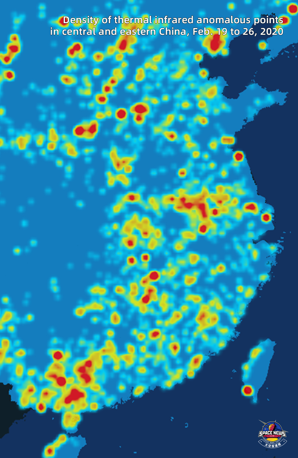 Satellite image shows the density of thermal infrared anomalous points in central and eastern China during the period from Feb. 19 to 26, 2020.