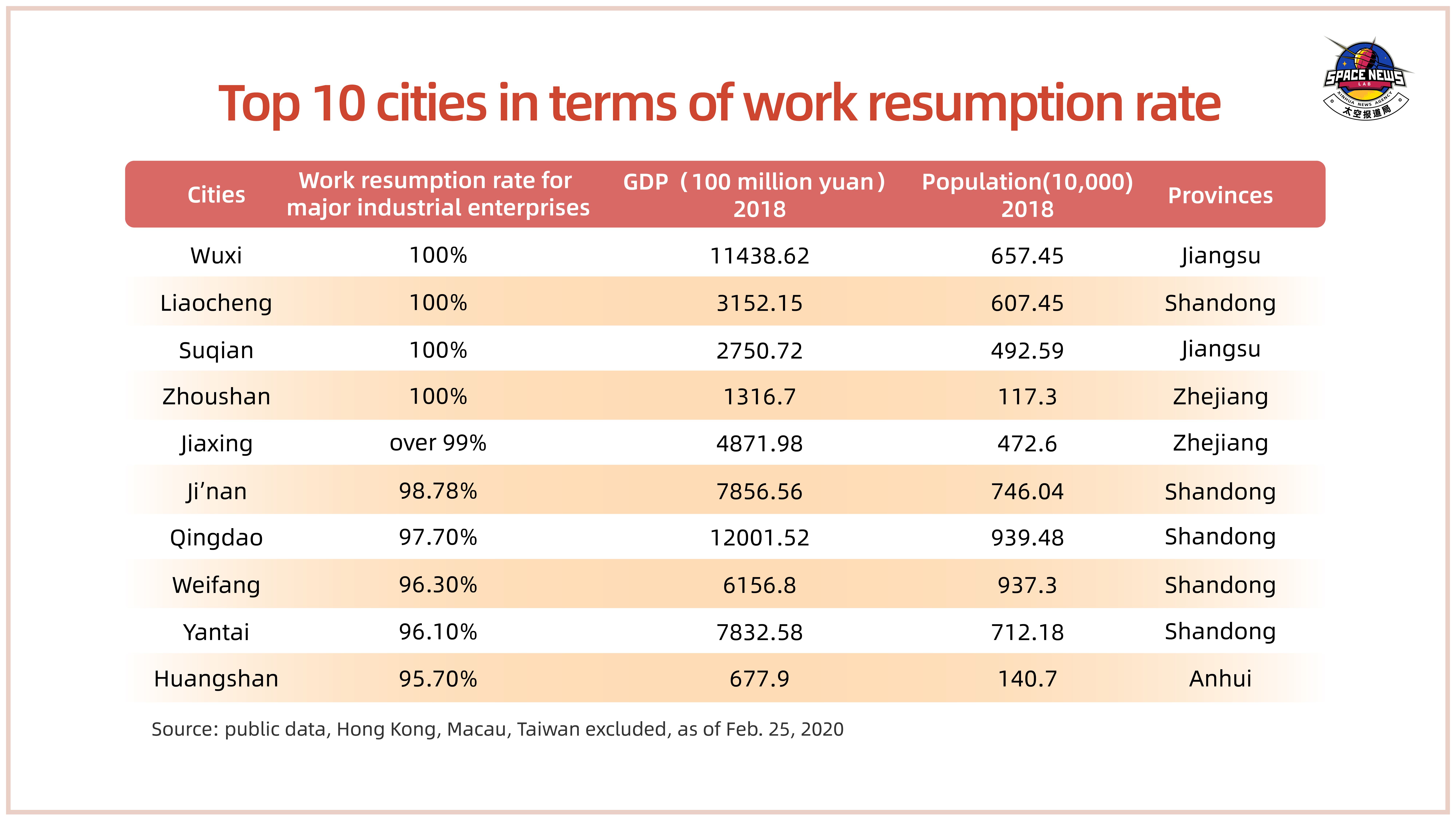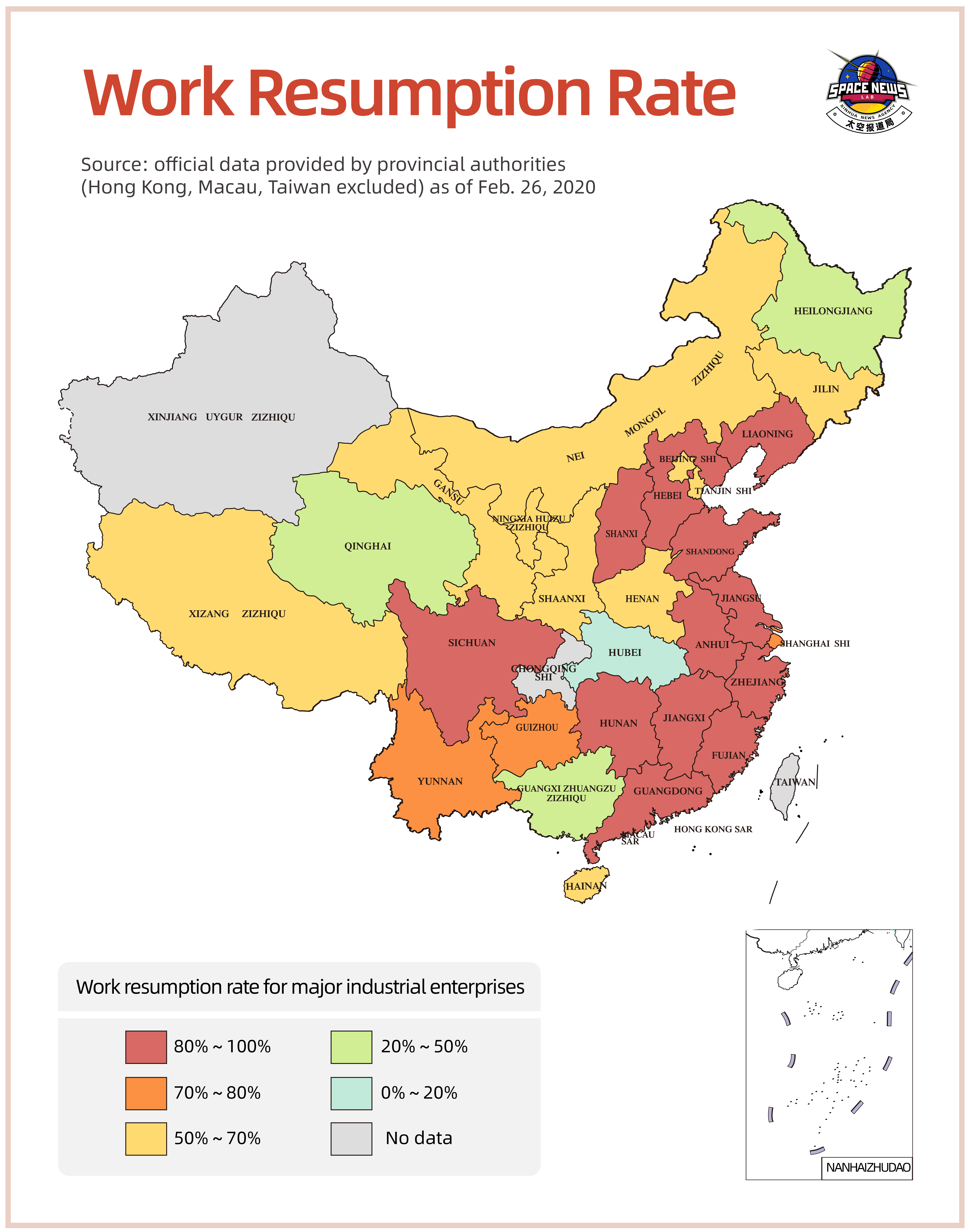The graphics show the province-level and city-level "work resumption rate" of the Chinese mainland, which reflects the percentage of major industrial enterprises that have returned to work.