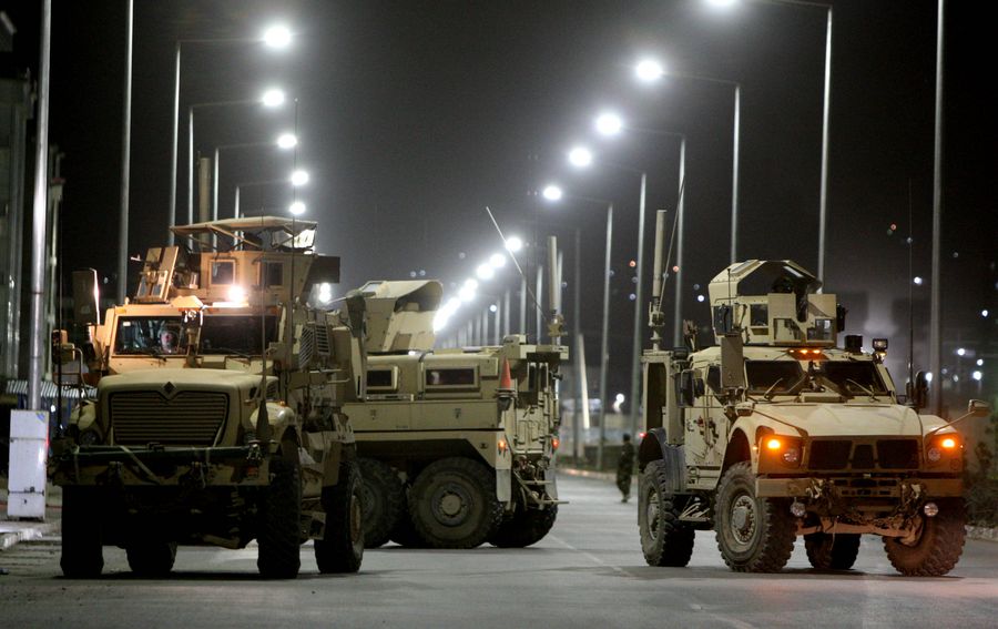 U.S military vehicles block the road following an attack by Taliban on a foreign compound in Kabul, Afghanistan on Aug. 8, 2015. (Xinhua/Ahmad Massoud)