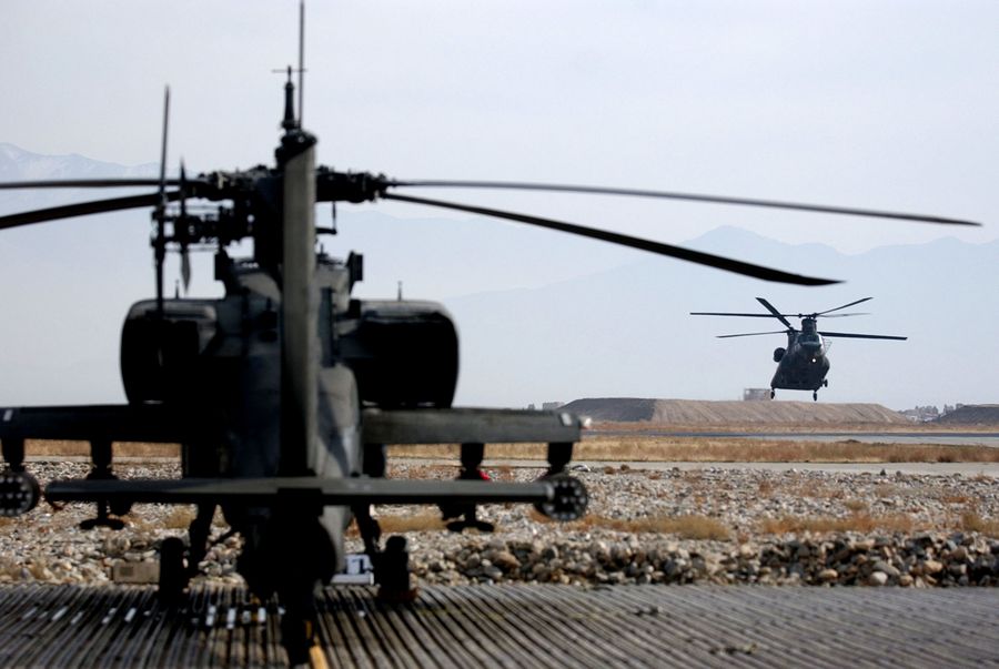 A U.S. military helicopter lands on Bagram Air Base 60 kilometers from Kabul, Afghanistan, Dec. 11, 2003. (Xinhua Photo/Wang Lei)