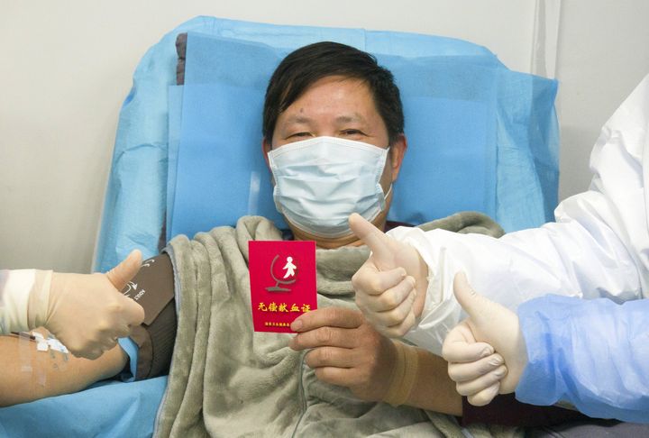 A recovered patient infected with novel coronavirus (COVID-19) donates plasma at the central blood center of Xingtai, north China's Hebei Province, Feb. 23, 2020. (Xinhua/Mu Yu)