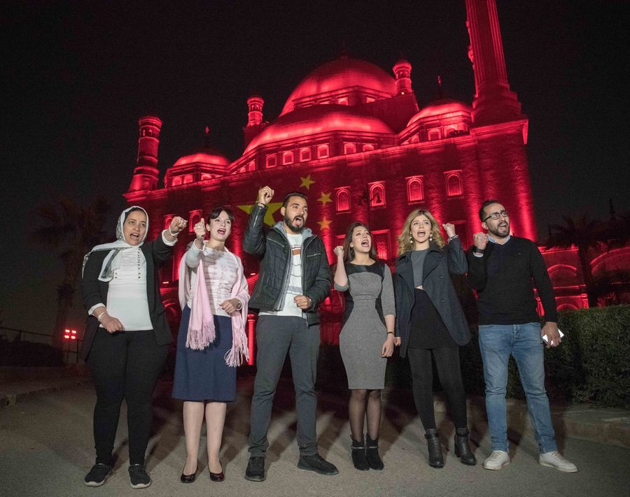 Chinese-speaking Egyptian tour guides express their support for the Chinese people against the novel coronavirus near Saladin Citadel in Cairo, Egypt on March 1, 2020. (Xinhua/Wu Huiwo)