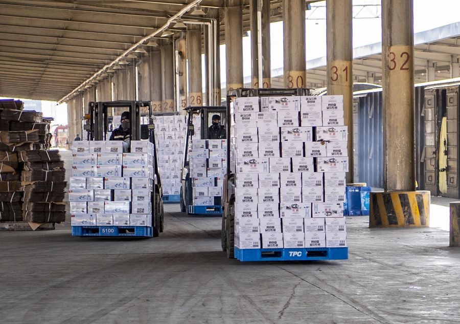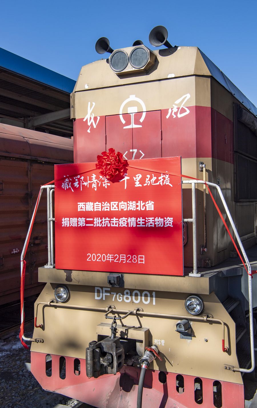 A freight train loaded with donations of life necessities to Hubei Province departs from Lhasa, southwest China's Tibet Autonomous Region, Feb. 28, 2020. (Photo by Peng Hong/Xinhua)■