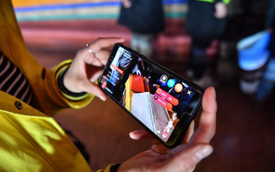 A tour guide shows the live streaming tour to the Potala Palace, a UNESCO world heritage, in Lhasa, southwest China's Tibet Autonomous Region, March 1, 2020. (Xinhua/Jigme Dorje)