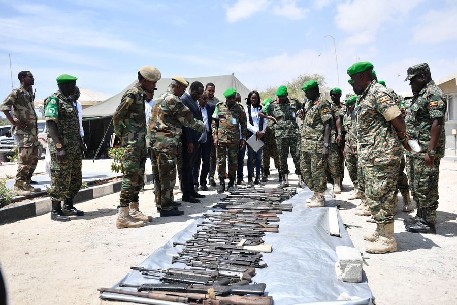 African Union Mission in Somalia (AMISOM) officials inspect an assortment of weapons during a handover ceremony in Mogadishu, capital of Somalia, Feb. 27, 2020. (Xinhua/Charles Onyango)