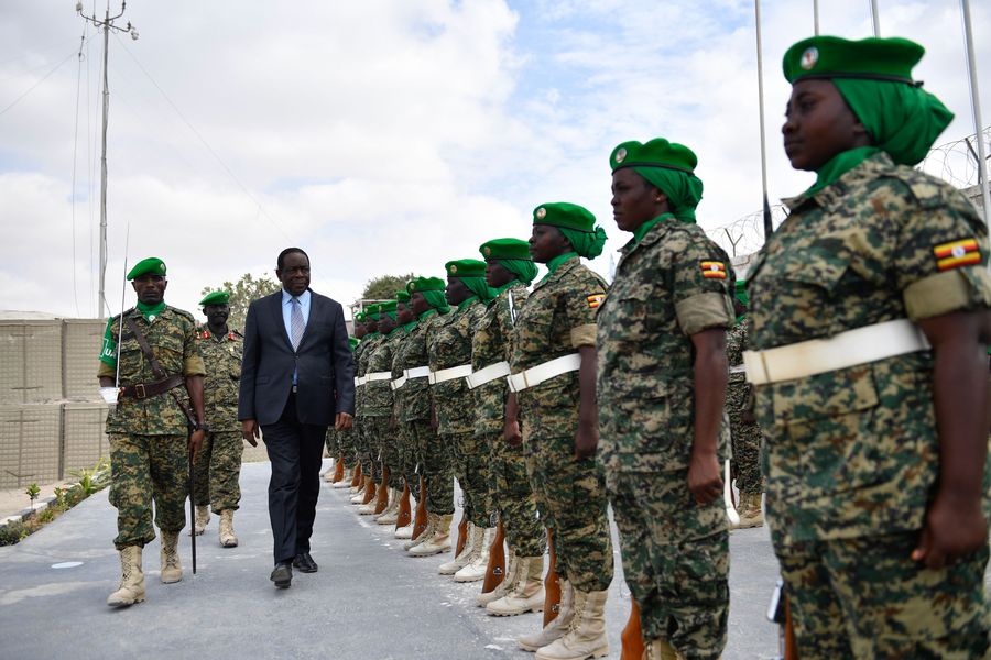 Francisco Madeira (C), Head of African Union Mission in Somalia (AMISOM), inspects a parade mounted by Ugandan contingent serving under AMISOM during a handover ceremony in Mogadishu, capital of Somalia, Feb. 27, 2020. (Xinhua/Charles Onyango)