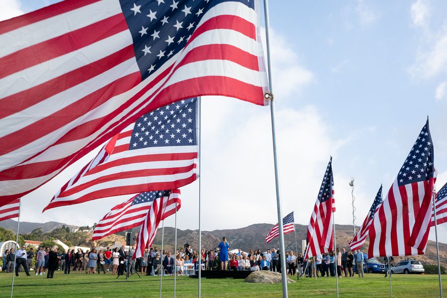 People visit the Pepperdine Wave of Flags display at Pepperdine University in Malibu, the United States, on Sept. 11, 2019. (Photo by Qian Weizhong/Xinhua)