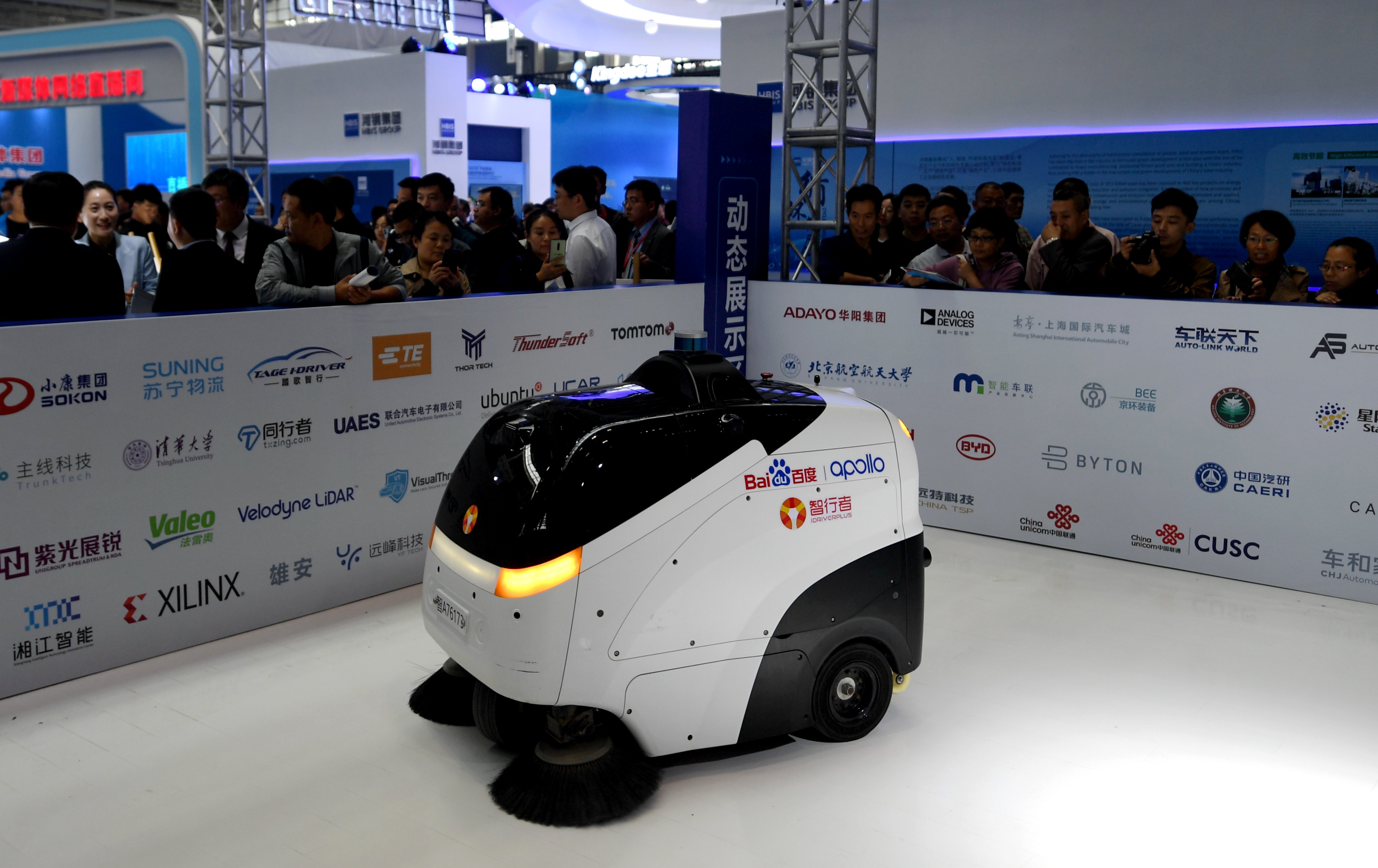 People watch a 5G driverless sweeping vehicle at the China International Digital Economy Expo in Shijiazhuang, north China's Hebei Province, Oct. 11, 2019. (Xinhua/Wang Xiao)