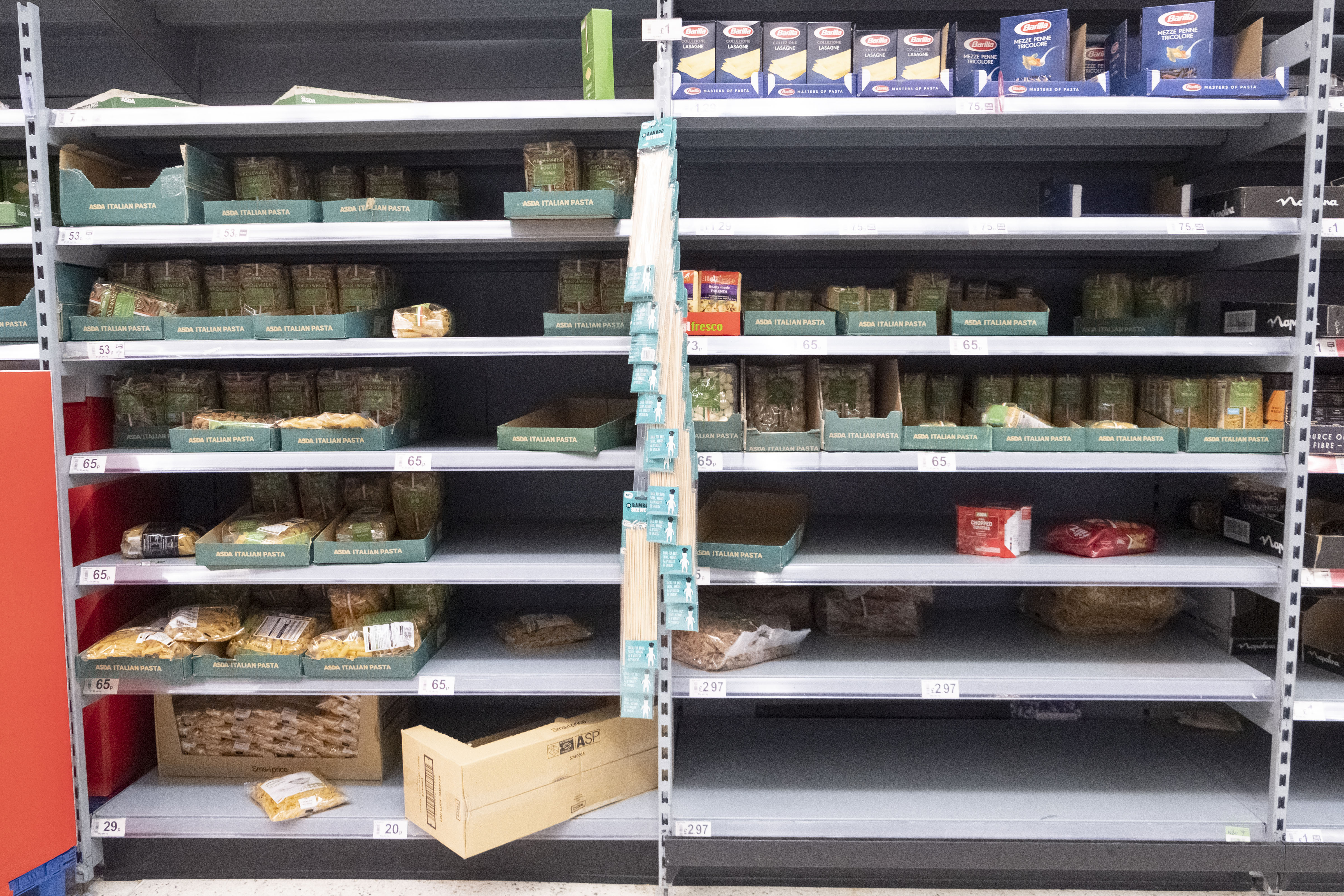 Photo taken on March 3, 2020 shows the almost-empty shelves of pasta at a supermarket in London, Britain. British Prime Minister Boris Johnson on Tuesday set out the government's action plan to tackle the spread of the novel coronavirus, as the number of infections reached 51 across the country. (Xinhua)