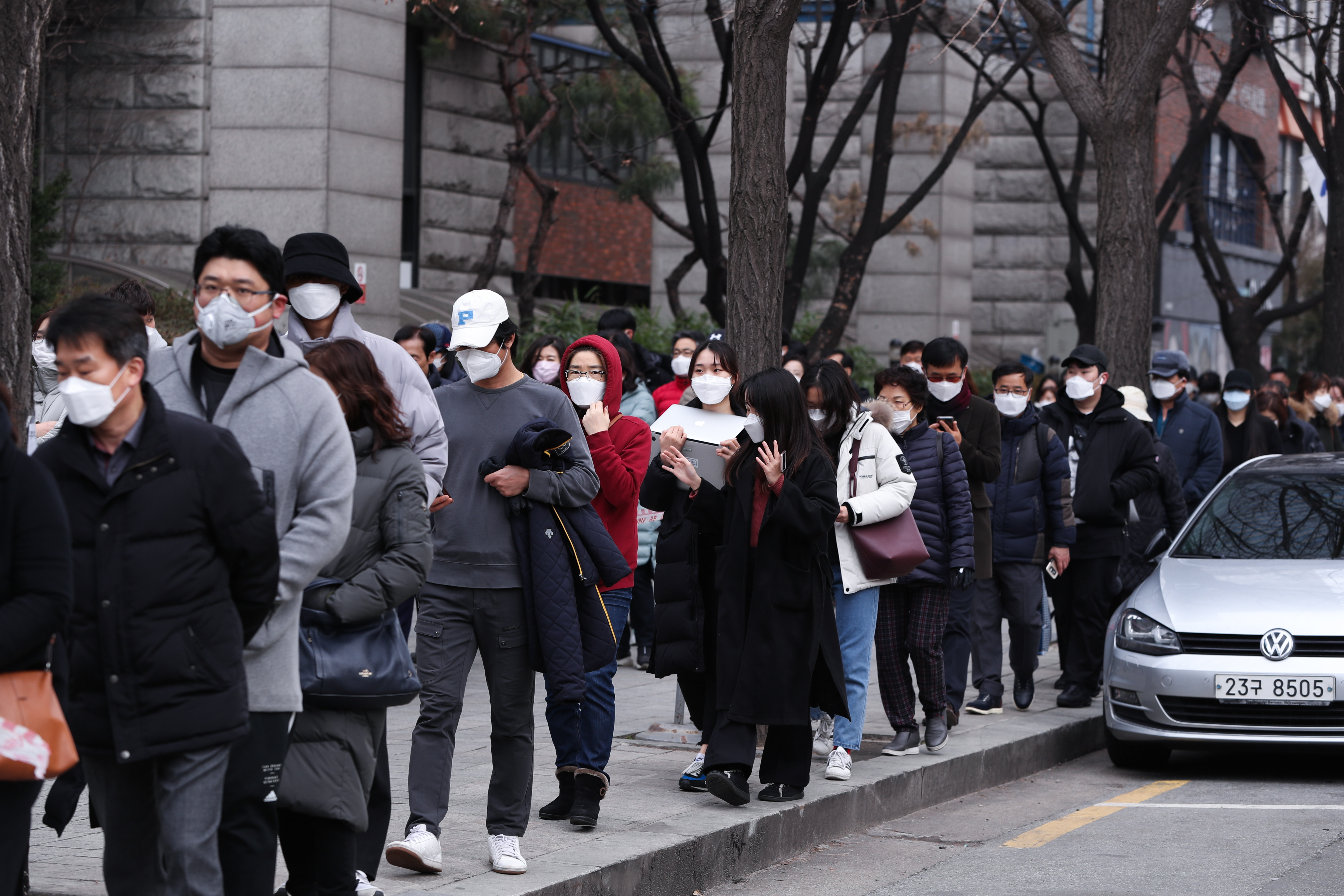 People line up to buy face masks in front of a department store in Seoul, South Korea, March 3, 2020, the last day for the store to sell face masks, with each person allowed to buy a maximum of five pieces. (Xinhua/Wang Jingqiang)