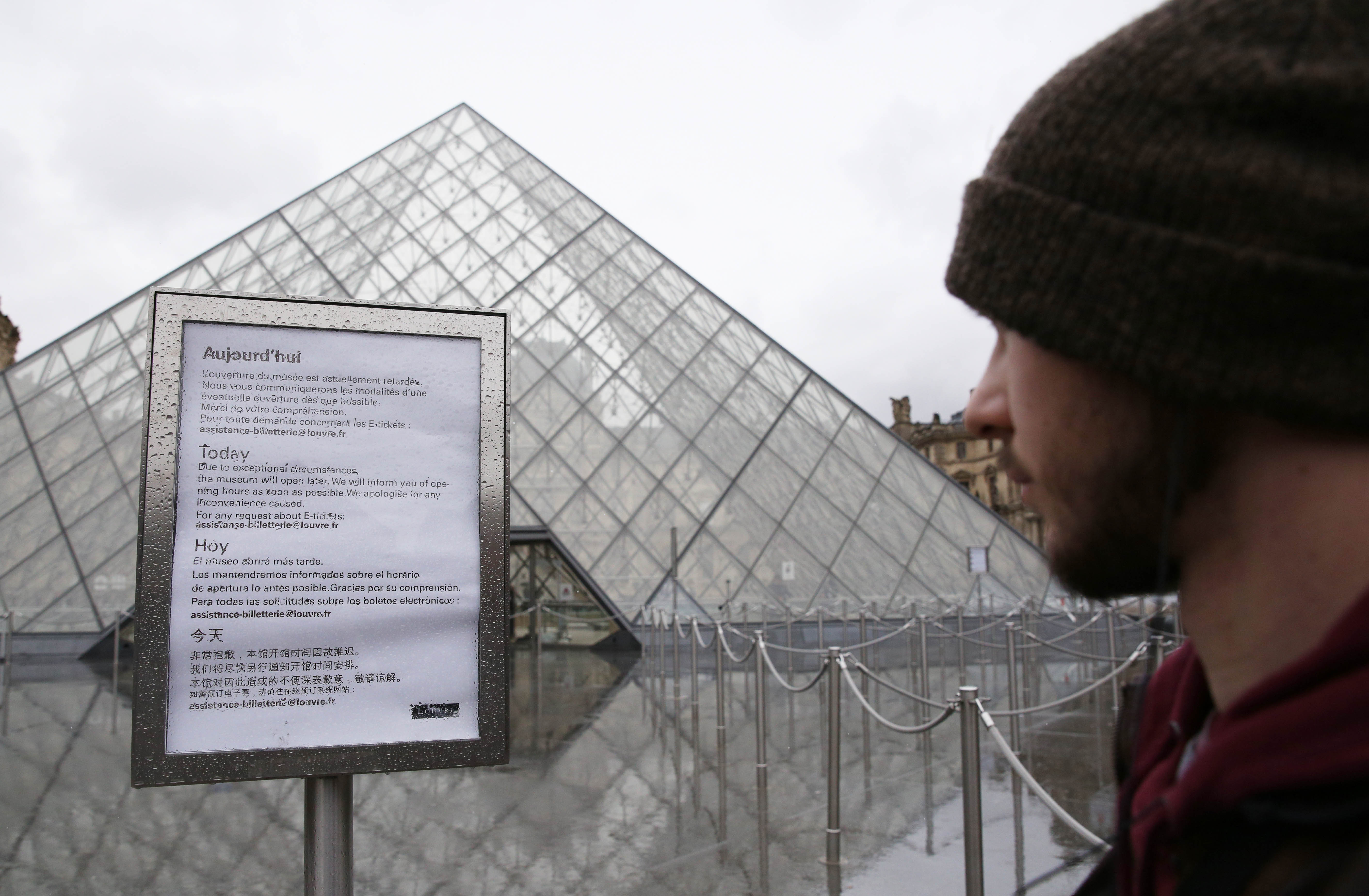 A tourist looks at the closing notice at the Louvre Museum in Paris, France, March 2, 2020. The Louvre Museum in Paris was closed due to the spreading coronavirus epidemic. (Xinhua/Gao Jing)