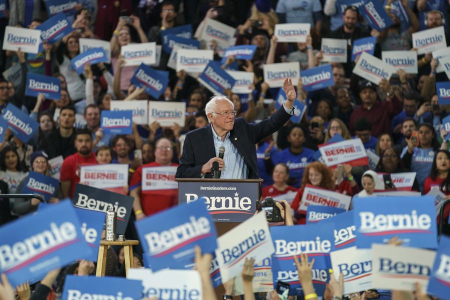 U.S. Democratic Presidential candidate Bernie Sanders attends a campaign rally in Springfield, Virginia, the United States, on Feb. 29, 2020. (Photo by Ting Shen/Xinhua)