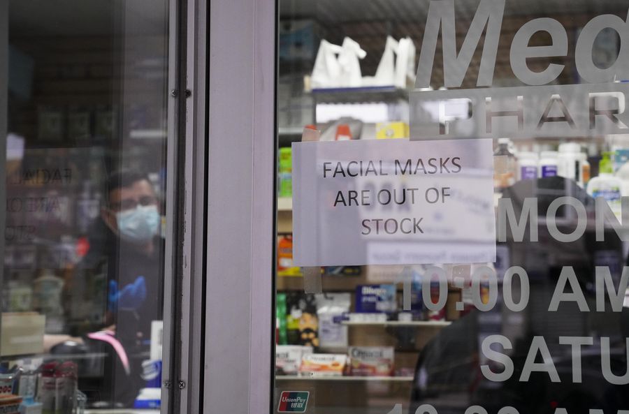 A notice showing "facial masks are out of stock" is seen on a door of a pharmacy in New York, the United States, Feb. 29, 2020. (Xinhua/Wang Ying)