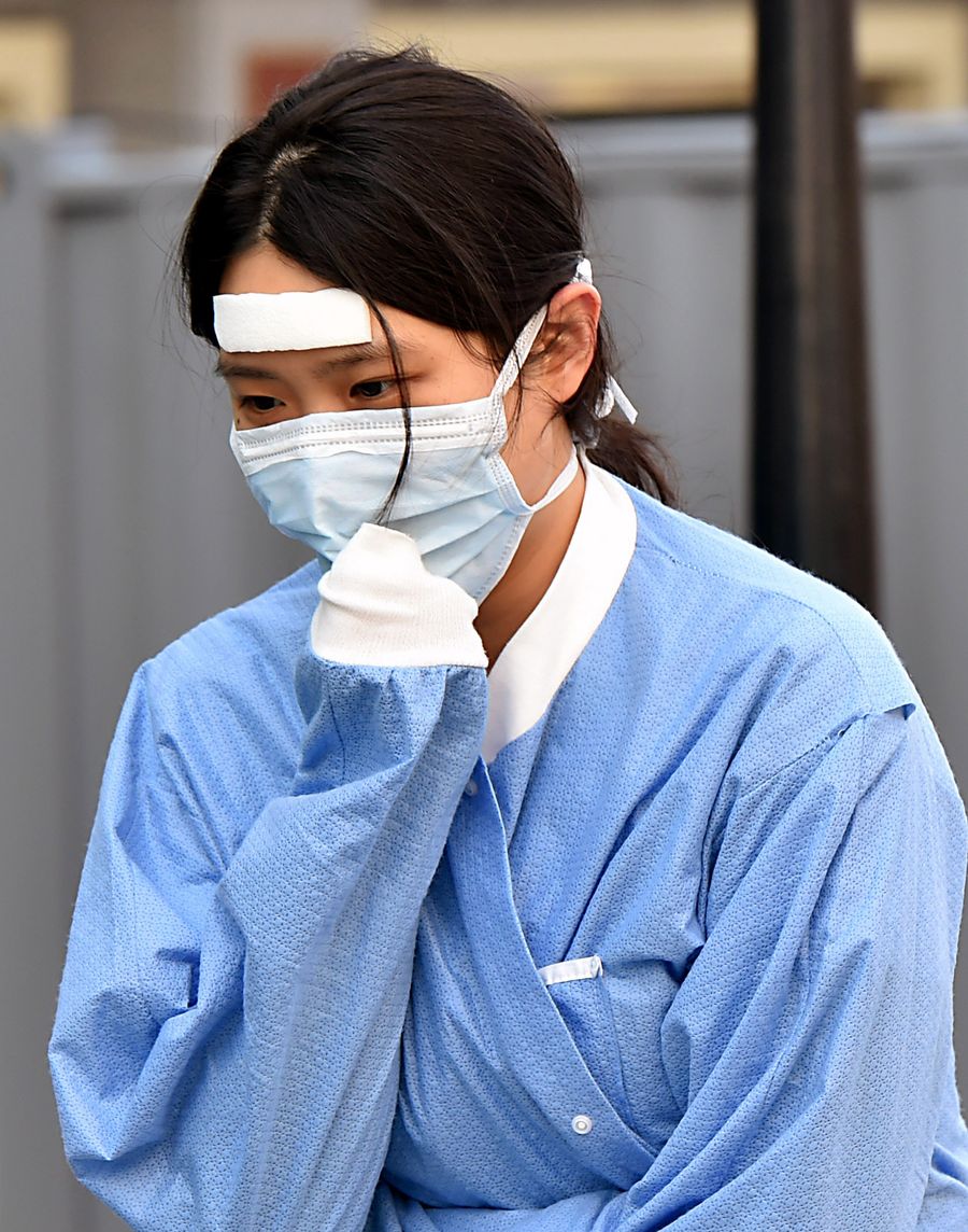 A medical worker with a protective gear sticking on the forehead is seen at a hospital in Daegu, South Korea, March 5, 2020. (NEWSIS/Handout via Xinhua)
